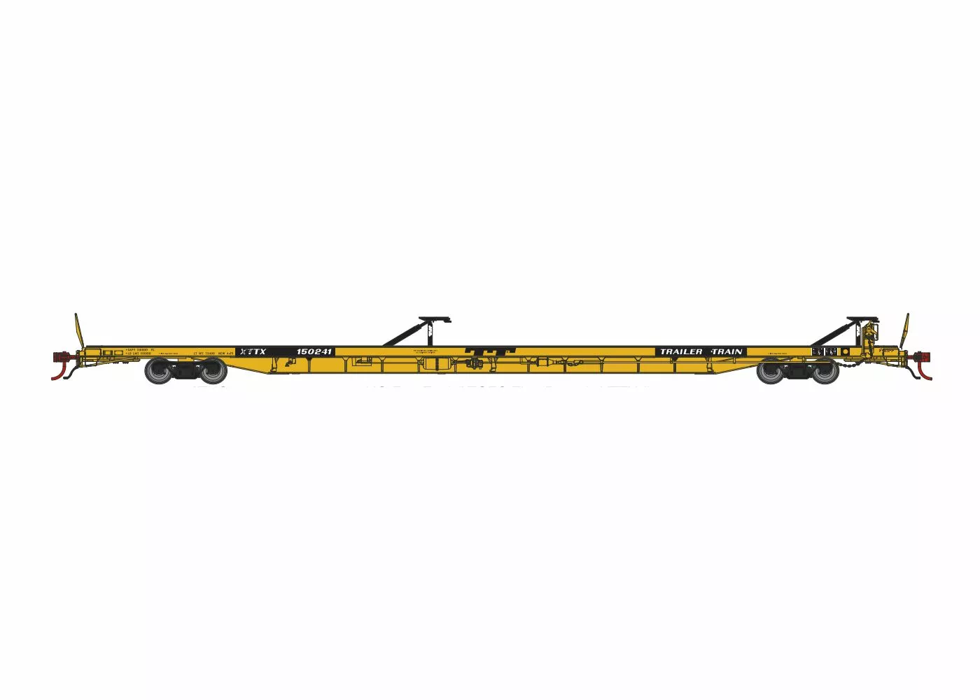 - It wasn’t unusual for these cars to see several different loading configurations throughout their careers, in order to meet the changing needs of shippers. In service with Trailer Train, the three or four-letter reporting marks indicated the cars’ intended service and corresponding equipment. For example, an “XTTX” car was equipped with four collapsible hitches, capable of carrying various combinations of 28′, 40′, or 45′ trailers. A car in the “RTTX” configuration featured a pair of fixed hitches at the ends, and a retractable hitch amidships, allowing it to carry a pair of long (up to 45′) trailers back-to-back, or three 28′ “pup” trailers.
