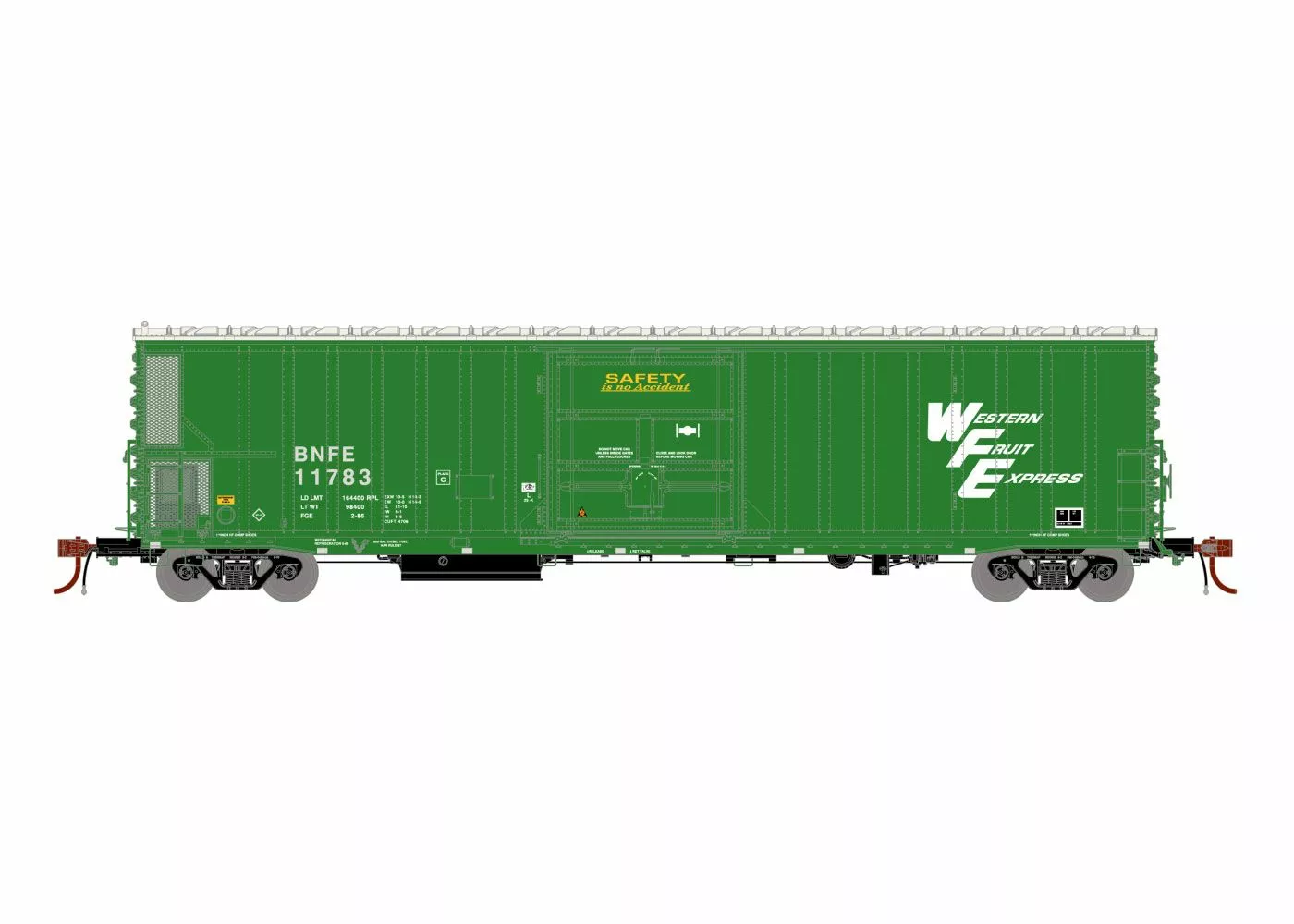- 100-ton roller bearing trucks with 36” machined metal wheels that operate on all Code 55 and 80 rail
