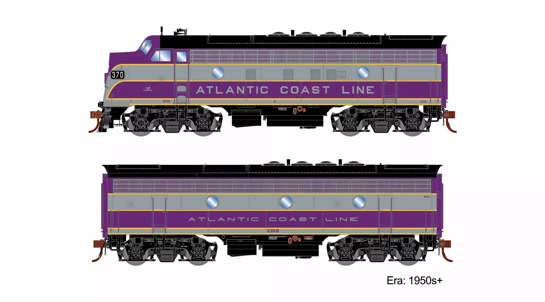 Part of ACL’s initial F7 order, units 348-371 came decked out in the road’s eye-catching purple and silver scheme. Delivered with small lettering, this was later revised to larger Atlantic Coast Line font, as depicted on our models.