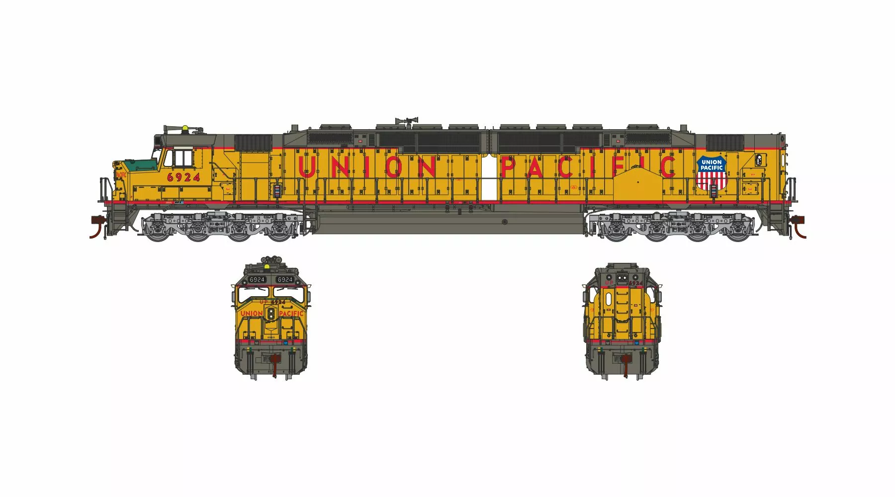 - #6936 Union Pacific preserved heritage service unit, ditch lights, yellow frame stripe, cab-mounted strobe, late anti-climbers, late electrical cabinet